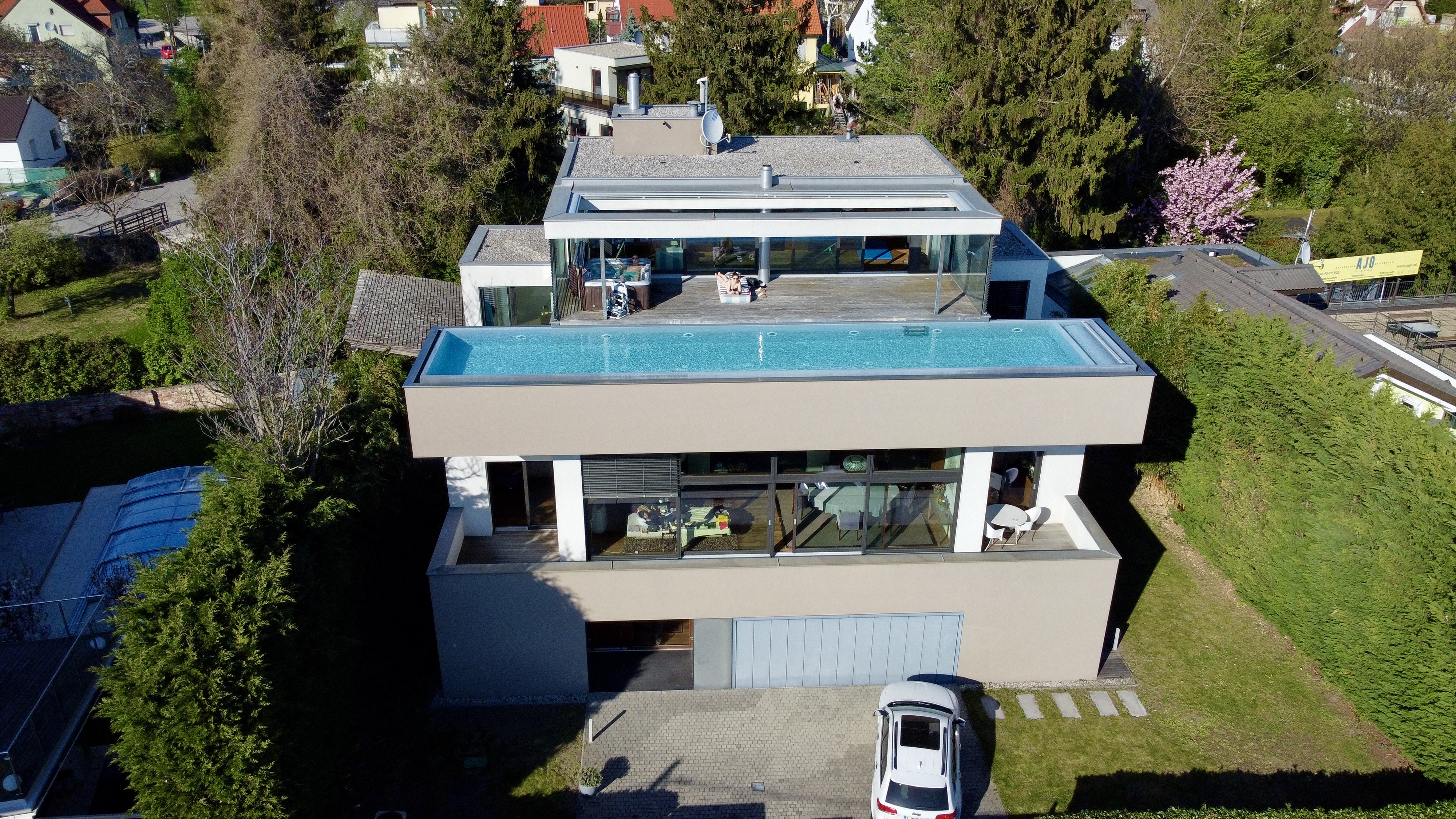 This shared home offers two independent people a generous, clearly structured living environment – over 300 m² across four levels, with a two-storey living room, fireplace, designer kitchen, infinity rooftop pool, panoramic sauna and a wide view across the Alte Donau.