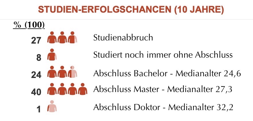 Es wird deutlich, wie entscheidend eine fundierte Studienberatung ist. Die Statistik zeigt, dass ein Drittel aller Studierenden ihr Studium entweder abbricht oder nicht abschließt. Studienwechsel aufgrund von Enttäuschungen bei der ersten Studienwahl sind die Hauptursache für lange Studiendauern in Österreich. Das liegt an impliziten oder expliziten Erwartungshaltungen im familiären Umfeld, Orientierungslosigkeit, Überforderung, Unkenntnis der eigenen Talente und Versagensängsten.