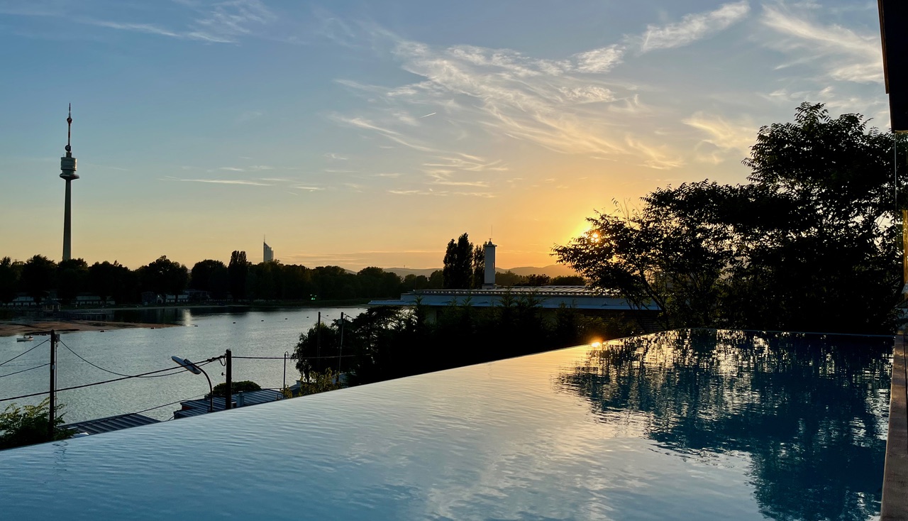 Noch einmal gemeinsam schreiben, Ideen wachsen lassen — und am Abend am Pool sitzen, mit Blick über die Alte Donau und die Wiener Skyline.